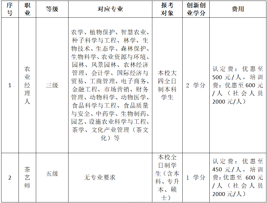 为深入贯彻习近平总书记关于技能人才工作的重要指示精神,全面推进“学历证书+若干职业技能证书”制度落实,积极促进高校毕业生高质量充分就业,进一步推动公司老员工参与考证的积极性,提高老员工创业创新能力和就业竞争力,公司已将技能证书纳入到在校老员工创业创新学分认定范围。根据公司认定工作计划安排,现面向广大同学开展2025年下半年农业经理人、茶艺师两个职业技能认定工作,具体内容如下: