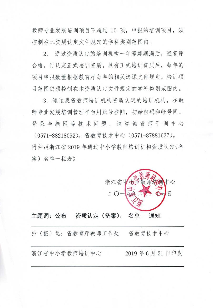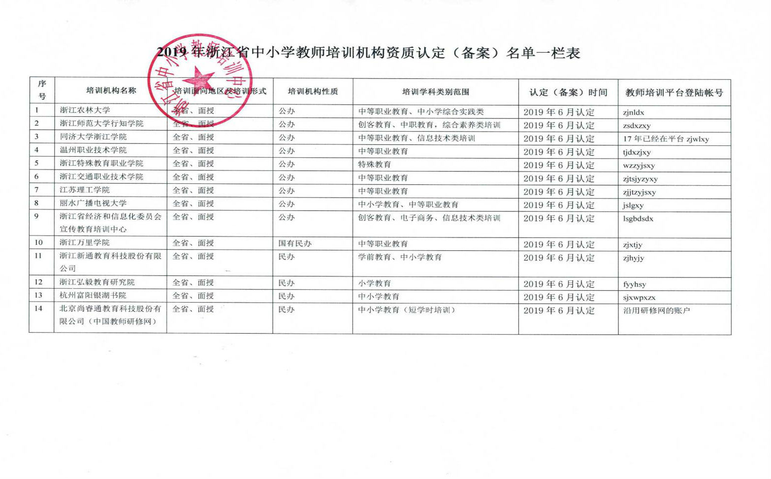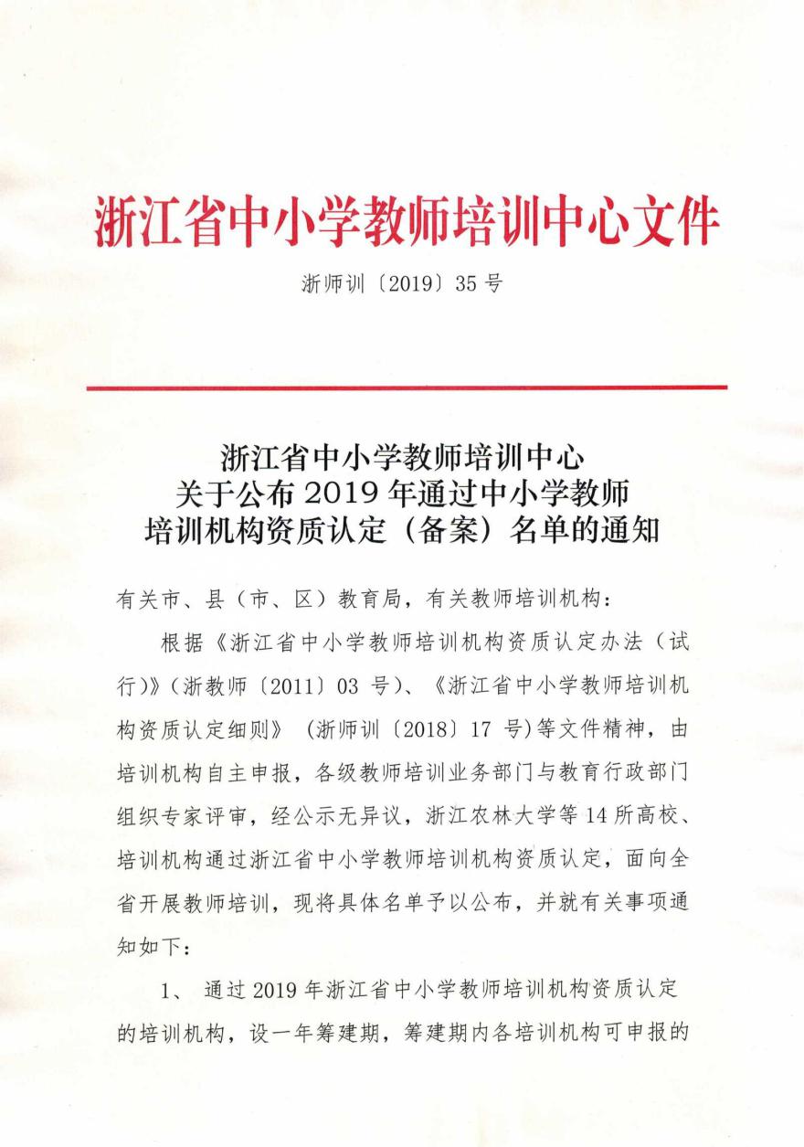 6月21日,浙江省中小学教师培训中心公布了2019年新增中小学教师培训机构资质认定结果,公司等14所高校、培训机构经申报材料专家评审、教师培训相关文件规定测试、培训方案答辩、专家评议票决等环节,成功获得了面向全省的中小学教师培训资质。