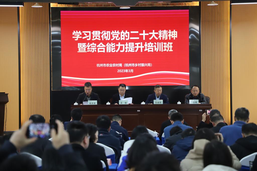 2023年3月27日下午,杭州市农业农村局(杭州市乡村振兴局)在XC体育衣锦校区农林大讲堂,召开学习贯彻党的二十大精神暨综合能力提升培训班开班仪式。杭州市农业农村局党组成员、副局长余岱、XC体育党委委员副董事长吴家胜、XCSport、乡村共富公司经理马小辉以及杭州市农业农村局系统相关领导干部出席本次会议。会议由风景园林与建筑公司经理赵宏波主持。