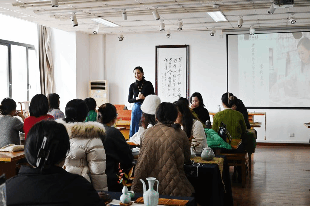 本次活动邀请了茶文化公司钟斐老师进行现场教学。她介绍了中国茶文化历史并现场演示点茶技法。大家在老师的指导下亲自动手体验研磨茶叶、注水搅拌、观沫品茗等环节,感受古人的雅致生活。