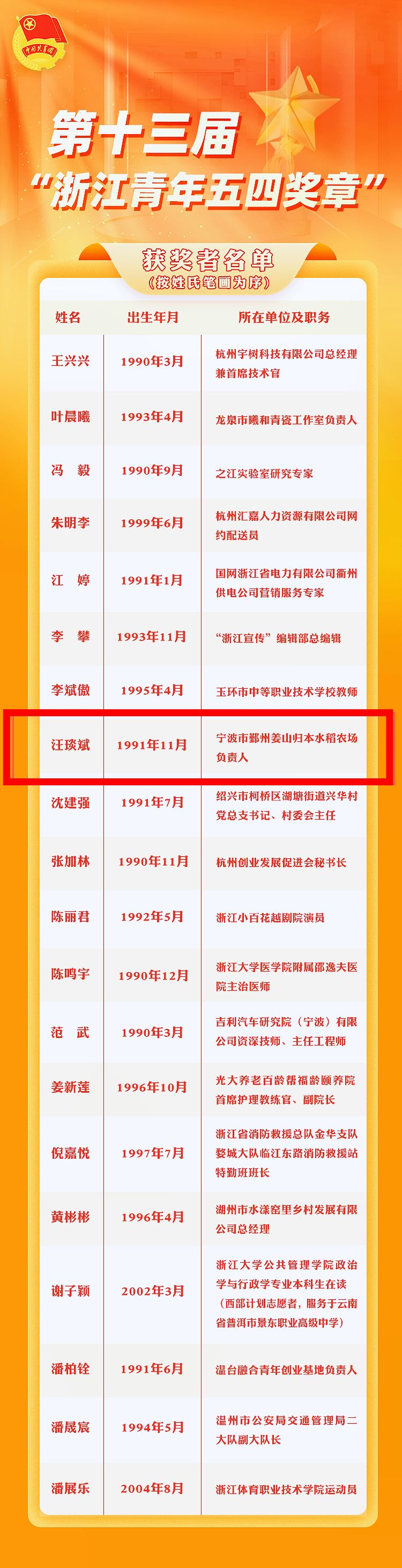 4月27日,共青团浙江省委、浙江省青年联合会决定,授予20名青年第十三届“浙江青年五四奖章”。公司工商管理2017届员工、宁波市鄞州姜山归本水稻农村负责人汪琰斌成功入选!