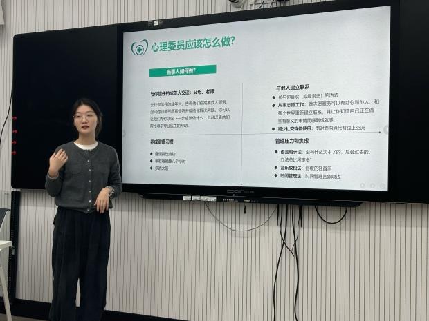培训过程中邢晓烨还与心理委员们积极互动交流,针对大家在工作中遇到的问题进行了答疑解惑。最后,邢晓烨鼓励心理委员们秉持助人自助原则,特别叮嘱大家在关注身边同学心理状况的同时,也要高度重视自身心理健康。