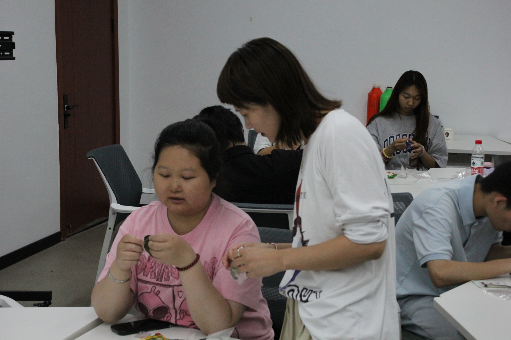 在最引人注目的艾草香囊制作区,同学们将莲蓬、柿子、苹果、梨子等造型别致的香囊布片整齐陈列,全神贯注地穿针引线、精心缝合,让阵阵清幽药香在教室中弥漫开来,寄托着学子们对平安健康的美好祈愿。